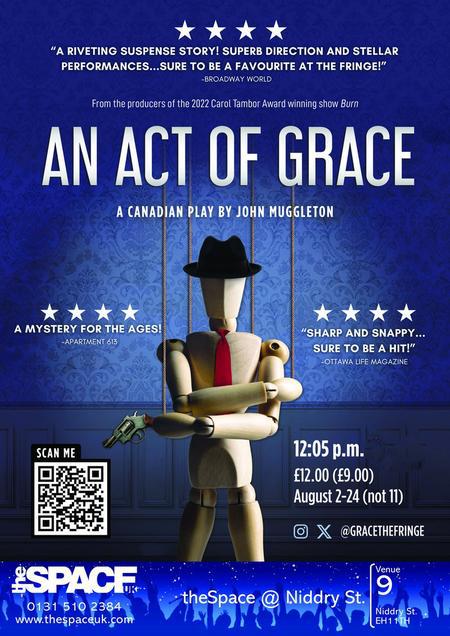 An Act of Grace by John Muggleton is a highly acclaimed, dark comedic thriller and "whodunit" play featuring sharp dialogue, strong performances, and multiple plot twists, often described as a gripping "rollercoaster". Originally an Ottawa Little Theatre production, it garnered 4-5 star reviews during its 2024 Edinburgh Festival Fringe run.
